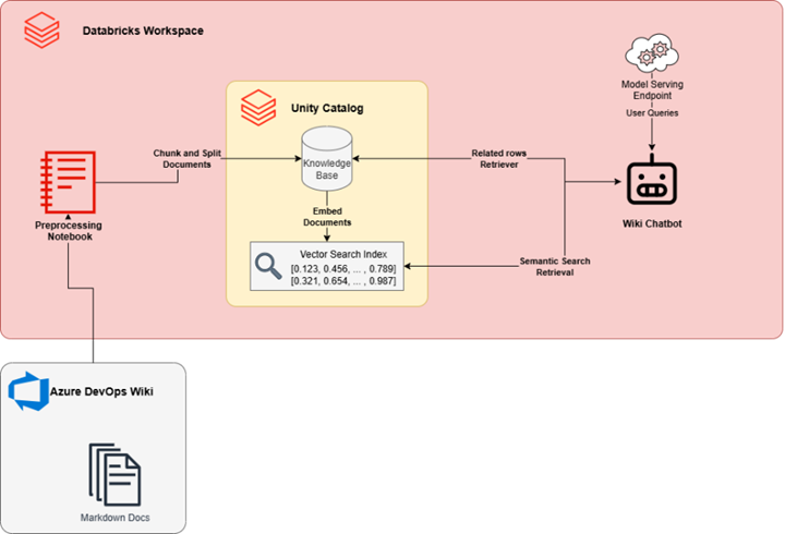 - Unity Catalog holds cleaned and structured wiki content.