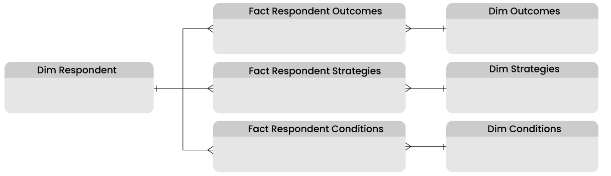 The approach for modelling the survey data to support this enhanced analysis involves carefully planning the assessable outcomes required to be measured and splitting the data out from the single source table into dimensions and facts in a star schema.